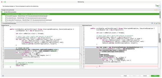 Figure 1b illustrates the results of the refactoring through IntelliJ IDEA [24]. This type of refactoring cannot be directly provided in IDEA; however, it can provide refactoring in the form of the template code. The template code means pre-editing the code that you want to generate and then generating it via shortcut keys at the place where it needs to be inserted. Lines 2–3 are the original code. The code template for the structured concurrency is on lines 4–10. It has no direct association with the original code and requires developers to manually modify the template according to the original code. First, during the task iteration process, the generic type (T) should be replaced by the return type of the task. Because the name of the task set is unknown, a placeholder is left. It is necessary to insert the name of the task set into the original code at this position (line 5). Second, the code to obtain the results of the tasks should be added after the method scope.throwIfFailed. The code for task acquisition in Figure 1a must be inserted on line 10 in Figure 1c. Therefore, its definition needs to be moved forward, as shown on line 4 in Figure 1c. In general, this refactoring belongs to a semiautomated refactoring approach. The current integrated development environments do not support the automatic refactoring of the unstructured concurrency to structured concurrency.