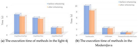For the project Light-4j, we selected Http2ClientPoolTest, Http2ClientTest, and Http2ClientPoolIT for testing. Figure 7a illustrates the execution times of these methods. After refactoring, the execution times of these methods in Http2ClientPoolTest reduced by 9.9%. The execution times of these methods in Http2ClientPoolIT showed a reduction of 5.8%, while the execution times of these methods in Http2ClientTest showed a decrease of 6.3% after refactoring. For the ModernJava project, we selected TestMovieDb, LinkScraper, and ThreadedPrimeNumberFinder for testing, with the results shown in Figure 7b. After refactoring, these methods in TestMovieDb showed a 16.6% reduction in execution time, while these methods in LinkScraper showed a more significant reduction of 5.3%. Finally, the execution times of these methods in ThreadedPrimeNumberFinder reduced by 7.3%. As is evident therefrom, with regard to diverse projects, refactoring is capable of leading to enhancements in execution efficiency.