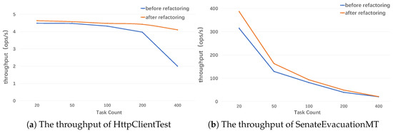 We also evaluated the changes in the throughput before and after refactoring for HttpClientTest in Light-4j and SenateEvacuationMT in CodeJam, with varying task counts ranging from 20 to 400, as shown in Figure 8. For HttpClientTest, the throughput before refactoring showed significant variability with different task quantities, as shown in Figure 8a. As the number of tasks increased from 20 to 400, the rate of the decrease in the performance continued to increase. During this period, the overall throughput dropped by 55.4%. When the number of tasks increased beyond 400, even memory overflow errors occurred. In contrast, the refactored code exhibited minimal fluctuations in the throughput with varying task numbers, showing only an 11.4% reduction in throughput when the number of tasks increased. For SenateEvacuationMT, the throughput variations before and after refactoring are generally consistent with different task quantities, as shown in Figure 8b. When the number of tasks increased from 20 to 400, the throughput for both the refactored and non-refactored code decreased by approximately 94%. The reason is that the underlying structure of the structured concurrency is based on virtual threads, which are lightweight threads attached to platform threads and significantly outnumber them. When handling I/O-bound tasks, the CPU often remains idle for extended periods, and the key factors limiting the program’s execution efficiency are the switching between threads and limitations on the number of threads. Because virtual threads are more lightweight than platform threads, they incur less switching overhead and can be provided in a much larger quantity. However, for CPU-bound tasks, the primary factor affecting the execution efficiency shifts to the CPU’s processing capability. Therefore, there are not many differences in performance before and after refactoring. However, in a multithreaded program, it can still reduce the overhead of the thread switching.