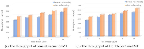 Both classes SenateEvacuationMT and TroubleSortSmallMT are from the project CodeJam. As we can see in Figure 9, the horizontal axes in these two pictures represent the number of test threads. With the increase in the number of test threads, the performance of SenateEvacuationMT before refactoring increased from 315 ops/s to 472 ops/s, with an improvement of approximately 49.8%. Meanwhile, the throughput after refactoring increased from 387 ops/s to 540 ops/s, which is approximately improved by 39.5%, as shown in Figure 9a. Moreover, in any number of test threads, the throughput of the refactored code is always higher than that of the non-refactored code. The situation of TroubleSortSmallMT is similar, as shown in Figure 9b. This indicates the stability of the program after being refactored to structured concurrency using ReStruct.