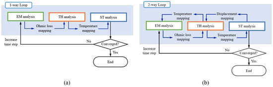 Moreover, because induction hardening involves temperature changes exceeding 1000 °C, it is crucial to incorporate material properties that dynamically adapt to temperature variations in real time to ensure accuracy. Traditional electromagnetic-thermal coupled analyses are typically conducted using a one-way coupling method, as depicted in Figure 2a. In this method, results from one analysis are sequentially passed to the subsequent analysis, limiting the ability to capture real-time changes in temperature-dependent properties. To address these limitations, this study employs a two-way coupling method, illustrated in Figure 2b. This method enables real-time data exchange among electromagnetic, thermal, and structural analyses, thereby accurately capturing the dynamic effects of temperature on material properties, such as electrical conductivity.