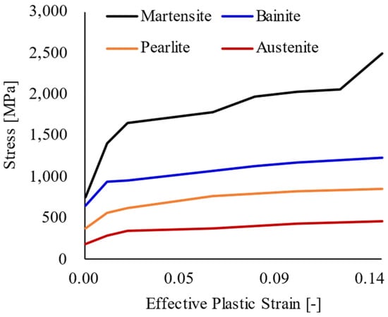 In this study, the simulation software LS-Dyna4.11 employs the MAT-244 material card to account for phase transformations [15]. This material card calculates phase ratios based on temperature values using a Continuous Cooling Transformation (CCT) diagram. It also integrates flow curves, as illustrated in Figure 3, to compute strain values according to the stress characteristics of each phase for structural analysis. By considering phase transformations, the simulation accurately captures changes in phase distribution during the heating and cooling processes. This approach enables precise calculations of deformation based on variations in material hardness across different regions of the component. The strain induced by phase transformations is critical for predicting residual stresses and can be calculated using Equation (16).