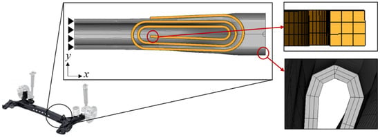 The model utilized in this study simplifies the actual geometry of the CTBA and the induction heating coil setup. While real induction heaters consist of multiple components in addition to the coil and the CTBA, their effects on the simulation are considered negligible and were therefore excluded from the analysis model. Although the actual CTBA exceeds 1200 mm in length, simulating the entire geometry would significantly increase computational time and hinder convergence. Consequently, a half-model was used, focusing on the interaction between the CTBA and the coil. The center of the CTBA, which is fixed during real-world heating, was represented using a fixed boundary, as shown in Figure 4. The finite element model applied in this study used 1 mm sized eight-node solid hexahedral elements with constant stress. To capture the skin effect, the mesh was constructed with three layers in the thickness direction, and hexahedral elements were used to improve convergence. The skin effect, characterized by induced currents concentrating near the conductor’s surface, was modeled to ensure that the simulated temperature distribution closely matches real-world phenomena [16,17].