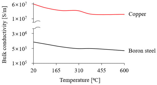 Material properties for the simulation were sourced from the software’s database. Boron steel was used to model the CTBA, while copper was used for the coil. The material properties are detailed in Table 1 [18]. Electrical, thermal, and structural properties were incorporated into the simulation, with electrical conductivity specified as temperature-dependent, as illustrated in Figure 5. The electrical conductivity decreases with increasing temperature due to the heightened vibration of metal atoms, which disrupts the flow of free electrons by increasing the frequency of collisions.