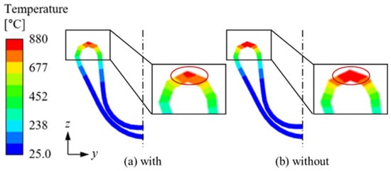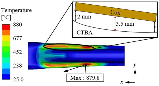 The heating analysis was conducted using an electromagnetic-thermal coupled method, yielding the temperature distribution illustrated in Figure 6. In Region a of Figure 6, where the coil made contact with the CTBA, the temperature distribution was uneven due to the non-uniform gap caused by the curved surface of the CTBA. The maximum temperature, 879.9 °C, was observed at the smallest gap of 2 mm between the coil and the CTBA, while the minimum temperature occurred at the largest gap of 3.5 mm. A similar temperature distribution pattern was identified in the symmetric region along the x-axis.