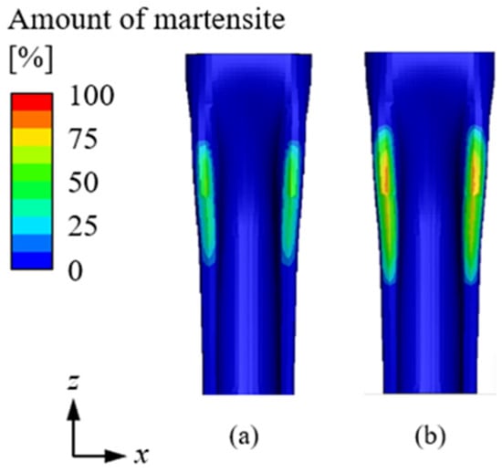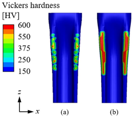 Building upon the heating analysis detailed in Section 3.1, quenching analysis was performed using a thermal-structural coupled method. Localized phase transformations can induce non-uniform volume changes and residual stresses, leading to structural deformation. This phenomenon is particularly significant in induction hardening, where rapid heating and cooling generate microstructural changes that influence mechanical stability [19]. Figure 8a presents the results under actual operational conditions, while Figure 8b shows the outcomes under ideal conditions, where the material was heated above 1000 °C and cooled within 11 s. A comparison of these two conditions reveals that, under actual operational conditions, the heating temperature did not exceed 1000 °C, and the cooling duration surpassed 12 s, failing to meet the criteria for martensitic transformation. As a result, the actual conditions exhibited a significantly lower martensite ratio compared to Figure 8b. As shown in Figure 9, the martensite ratio had a direct impact on the hardness distribution. The hardness results demonstrate that an increase in the martensite ratio corresponded to higher hardness values. Figure 9a illustrates the distribution under ideal conditions. Under actual conditions, the lower martensite content led to a less uniform hardness distribution, which could negatively affect the mechanical properties of the material. Additionally, transformation-induced plasticity (TRIP) effects may contribute to additional strain in regions where the martensite fraction is inconsistent. This transformation-induced strain can locally alter stress distributions, exacerbating residual stresses and deformation [20]. Following the quenching process, product distortion was evaluated to analyze its impact on assembly accuracy. The displacement results are shown in Figure 10. As indicated in Figure 10a, the z-axis displacement was most significant at Point P, measuring 0.94 mm. The cross-sectional analysis at Point P, presented in Figure 10b, reveals a height discrepancy relative to the design dimensions. Localized phase transformations occurring at Point P may have led to differential volume expansion and contraction, contributing to distortion. Point P corresponds to a welding section that connects to another component, and if the height difference is not corrected, it may result in misalignment and potential welding defects. This could compromise the structural integrity of the product.