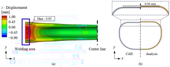 The maximum z-direction deformation at Point P was found to be highly consistent between the actual product and the simulation results. The measured deformation values were 0.97 mm and 0.93 mm, respectively, indicating an accuracy of approximately 96%. Additionally, the z-direction deformation along the product cross-section, spanning from welding Point A to center Point B, was analyzed, as depicted in Figure 13b. However, some discrepancies were observed between the experimental results and the FEA predictions, which are likely attributed to the simplifications in the FEA modeling. In particular, the omission of convection heat transfer in the simulation may have led to an underestimation of the cooling rate. In real-world cooling conditions, heat exchange occurs between the surrounding fluid and the workpiece, whereas the FEA model did not account for such external convection effects, potentially leading to variations in temperature distribution and deformation. Based on these results, the proposed analysis methodology is expected to demonstrate validity and reliability in predicting deformation behavior under real operating conditions.
