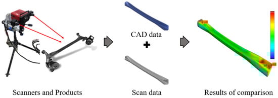 The deformation of the actual product was measured using a GOM ATOS 3D scanner (GOM mbH, Braunschweig, Germany) [22], a high-precision device equipped with dual cameras for accurately capturing reflective and curved surfaces. The scanning process and the appearance of the scanner are presented in Figure 12. To ensure an accurate comparison with finite element analysis (FEA) results, the scanned surface data were processed using Zeiss Quality Suite software (Ver. 4.5) [23]. The software aligned the experimental scan data with the original computer-aided design (CAD) model using a best-fit algorithm, correcting for positioning deviations. It then quantified shape deviations and visualized discrepancies between the scanned data and the FEA results. Additionally, the software identified localized defects and generated comprehensive analysis reports.