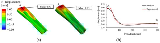 Comparison of CTBA z-direction displacement between experimental and FE analysis, (a) 3D geometry, and (b) A–B section.