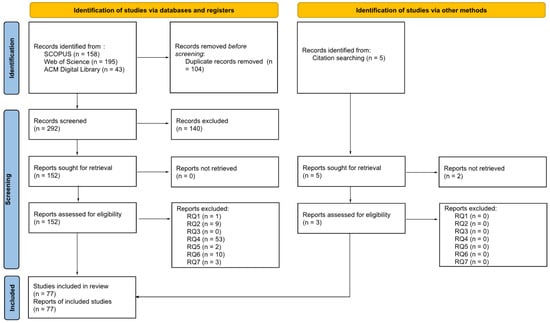 The following section presents the findings of this work, according to the research questions outlined in the Section 1. The selection process is illustrated through a PRISMA flowchart in Figure 1. In the first step, a total amount of 396 articles were recorded from the three different databases (SCOPUS, Web of Science, and ACM Library). After an initial review, during which duplicate articles were identified, a total of 104 redundant articles were removed from the database. The next step was a first screening based on title, abstract, and keywords, discarding another 140 articles. In the second screening of the selection process, an eligibility assessment was conducted, leading to the final set of 74 articles. Also, within the set of 74 articles, a citation search was conducted resulting in the inclusion of 6 additional articles. Following the same procedure as described above, only 3 articles from this expanded pool successfully progressed to the analytical phase.