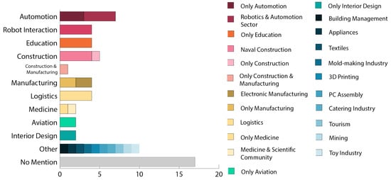 Figure 3 provides an illustration of the classification of the reviewed studies, starting with a general analysis and followed by more specific classifications as needed. The most prominent sector of Industry X.0 utilizing AR applications is the robotics sector (11 studies), followed by the automotive industry (9 studies). Also, the relevance of the construction sector is important (5 studies), with a specific emphasis on naval construction (4 articles). The education and manufacturing sector has the same number of related articles (5 articles). The manufacturing sector also holds a specific identification for the electronic manufacturing sub-sector (3 studies). The logistics sector had a higher level of influence (6 studies). At the next level of prominence, in the health sector, 4 related articles were identified. The following three sectors are each represented by two studies: aviation, interior design, and building management. Additionally, individual studies were identified within other sectors of Industry X.0, including appliances, textiles, mold-making industry, scientific community, 3D printing, PC assembly, the catering industry, tourism, mining, the toy industry, agriculture, and the energy sector. Lastly, there are 20 studies whose use cases are either within non-specific industries or not mentioned in the articles.