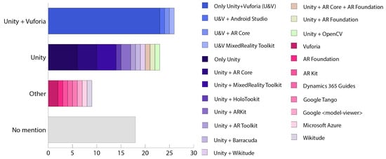 Some of these studies utilized multiple plugins/software items to achieve the implementation of the AR system in their projects. Figure 4 categorizes the plugins, emphasizing the integration of software used to implement the AR system across different hardware. The graph also uses color coding to distinguish between systems that employ different development software. In Figure 4, the categories “Unity + Vuforia” and “Unity” were separated due to the high number of articles using this software combination. Since Vuforia is a widely adopted plugin for Unity in AR applications, including it as a separate category allows for a clearer and more accurate representation of the distribution of tools in the reviewed studies. This distinction is further analyzed separately in the discussion section.