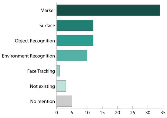 A classification is represented in Figure 5. The most used system in the included articles was markers, with a total of 34 studies using this system. The second most used were surface detection and object recognition (12 studies). In third place, environment recognition had the same usage rate (10 studies each). A total of 3 studies did not use any environment-detection system to place the virtual elements of their application. There was only one study that used the face-tracking system in its application. Finally, there were five studies that did not reference the detection system used, nor was there any indication of the system used.