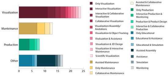 Figure 6 displays a classification of the articles based on the purpose of their application. If an application serves multiple purposes, this is also indicated in the accompanying graph. The most common purpose in the reviewed articles is the visualization of information over real-life objects (32 studies). Within this group of applications focused on visualization, there are more specific subgroups: interactive visualization (6 studies) and collaborative visualization (5 studies). The second most common general purpose is maintenance (15 studies), which includes more specific subgroups: assisted maintenance (7 studies), collaborative maintenance (3 studies), and assisted and collaborative maintenance (1 study). The next most relevant group of applications focuses on product manufacturing (10 studies). Within this group, there are subgroups with more specific purposes: interactive production (4 studies) and collaborative production (2 study). The product assembly category is also relevant (7 studies). The following significant category in this review is applications aimed at operator assistance applications (10 studies). Less prominent is the category of employee education and training (9 studies). The subsequent level of relevance includes three groups of applications, each with the same number of related articles (2 studies each): product design, monitoring, and event simulation. At the lowest level of relevance, there are two groups, each with one related article: product annotations and object tracking.