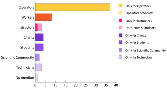 This classification is depicted in Figure 7, which also includes some of the analyzed studies presenting applications with use cases involving users with different roles. The most recurrent target user in this analysis were operators (50 studies). The second most targeted user group by the applications were workers (8 studies). With less frequency, the next groups were teachers, students, and technicians (6, 6, and 5 studies respectively). The least frequent target user groups were customers (4 studies) and the scientific community (2 studies). Finally, there was only one study that did not mention the target audience for the developed application.