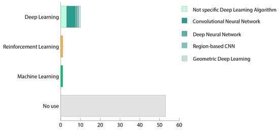 Most of the reviewed documents did not reference or use any artificial intelligence algorithms to improve the service they offer (63 studies). Additionally, a Table A1 in Appendix A is presented that relates the algorithms used with the objective or characteristic intended to be improved. Figure 8 offers a visual classification of the data presented in this section. Among the studies that did use artificial intelligence algorithms, the most used were Deep Learning algorithms (10 studies). With less frequency, the use of Reinforcement Learning algorithms was found (1 study), and the use of Machine Learning was also found (1 study). More specifically, within the studies that used Deep Learning algorithms, the following classification was made: Convolutional Neural Network (4 studies), Region-based Convolutional Neural Network (1 study), Deep Neural Network (1 study), and Geometric Deep Learning (1 study).