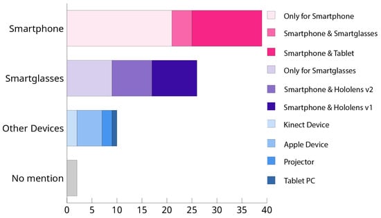 The most used hardware to run the services was smartphones (39), where some applications were also tested on tablets (14) and smartglasses (4). The second most used system was smartglasses (30). Taking a deeper look at those studies, it is observed that some used HoloLens v2 (8), while others utilized HoloLens v1 (9). Less frequently, tablets were also used as execution systems (15), with one study using a tablet with a Windows operating system (Tablet PC). The case of the tablet using Windows as its operating system cannot be grouped with the rest of the studies due to the difference between their operating systems [35]. Apple systems were also selected for running certain applications (5), encompassing different company devices (iPad Air, iPhone). The least used systems were projectors (2) and the Kinect camera system (1). In two of the studies analyzed, the authors did not specify the system used to run the developed application.