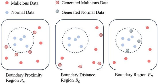 Using the label-corrected training set, , the data generation module is designed to create new training samples through the generator network G. This module expands the training dataset by synthesizing both normal and malicious samples consistent with the underlying data distribution. Notably, new malicious data is expected to appear in two specific regions of the data distribution. The first region, referred to as , represents the boundary area of normal data. Since sophisticated attackers often mimic normal behavior to evade detection, emerging malicious samples may increasingly resemble normal data, situating themselves near the outer boundary of the normal data distribution. The second region, termed , lies outside the original dataset. Novel attack techniques, such as zero-day exploits, can lead to harmful data that is entirely distinct from both normal and previously known malicious data, appearing in areas beyond the original dataset’s scope. However, generating additional malicious training samples exclusively in and could exacerbate data imbalance. An excessive volume of malicious samples in specific regions might cause the machine learning model’s decision boundary to shift toward normal data regions, thereby increasing the likelihood of harmful predictions. To address this, the module also generates samples within the internal boundary of the normal data, referred to as . This approach reduces false positives and improves overall classification performance. Figure 4 illustrates the various data generation strategies.