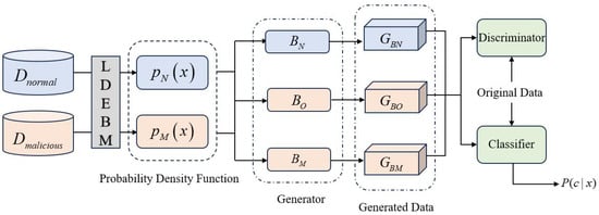 The article designates , , and to represent the novel data generated by the three generator networks targeting , , and , respectively. This synthetic data, along with the training dataset (comprising normal data and malicious data ), is provided as input to the discriminator. Similar to a conventional GAN, the generators produce new data that aligns with the target distribution while maintaining significant variability. The discriminator’s objective is to classify all input data—both original and synthetic—into normal or malicious categories. This encourages the generators to create data that improves the classification accuracy of machine learning models. The loss function for the discriminator is defined as follows: