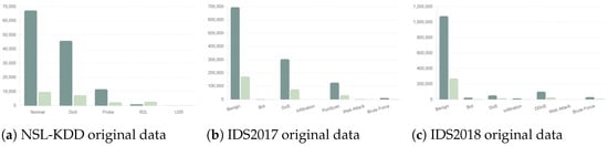 In this section, we conducted experiments and evaluations on classic datasets commonly used in the field of ICS intrusion detection, including the NSL-KDD dataset, the recently released CIC-IDS2017 dataset, and the CSE-CIC-IDS2018 dataset. Although relatively older, the NSL-KDD dataset has been extensively validated by numerous methods, making it suitable for comparative studies. It contains labels for five attack types and one normal traffic type. The specific attack types are DoS (Denial of Service), Probe, R2L (Remote-to-Local), U2R (User-to-Root), and Normal traffic. The CIC-IDS2017 dataset, developed by the cybersecurity research group at the Royal Military College of Canada, consists of real-world network traffic data. Samples in CIC-IDS2017 are labeled as normal traffic or various network attack types, such as Brute Force FTP, Brute Force SSH, DoS, Heartbleed, Web Attacks, Infiltration, Botnet, and DDoS attacks. Due to similarities among some attack types, we grouped them into seven specific classes. The dataset is split in a 4:1 ratio, excluding data from four days of traffic for training, except Monday. The CSE-CIC-IDS2018 dataset offers a more complex, real-world data environment compared to CIC-IDS2017, with additional challenges such as missing values and redundant features. For testing, we utilized 10% of this dataset. All three datasets exhibit characteristics of class imbalance, as shown in Figure 7, where the dark green represents the distribution of various types of data in the training set, and the light green represents the test set. For clarity in the diagrams, CIC-IDS2017 is labeled as IDS2017, while CSE-CIC-IDS2018 is labeled as IDS2018.