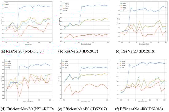 This part examines how different class distributions affect the performance of Federated Learning algorithms. To simulate the distribution of client data, the Dirichlet distribution was utilized in the experiments. The parameter controls both the level of class imbalance and the diversity among clients. Experiments were conducted using five values: 0.1, 0.07, 0.05, 0.03, and 0.01. As decreases, client datasets exhibit stronger bias toward minority classes, leading to increased diversity and greater class imbalance, which presents challenges for training the model. The ResNet20 architecture was used in experiments conducted on the NSL-KDD, CIC-IDS2017, and CSE-CIC-IDS2018 datasets. Comparisons involving SCAFFOLD were excluded in this section because of its poor performance under low client sampling frequencies, as shown in Table 2.