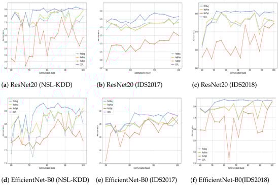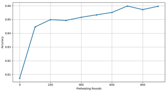 This section examines the influence of various warm-up rounds on performance. The ResNet20 model was employed to conduct experiments on the NSL-KDD dataset, with 10 uniformly distributed Rw values within the range of [0, 900]. Figure 10 illustrates the outcomes. Inaccurate global data distribution information is the consequence of the global model’s insufficient training when is assigned to 0. The quality of virtual data generated by the data generator is adversely affected by this condition, which in turn impacts the training of local models and the overall performance of the global model. The data generator generates higher-quality simulated data as increases from 0 to 700, leading to the acquisition of more precise data distribution information from the global model. This improvement enhances the efficacy of the global model by improving the training quality of local models. The global model’s optimal performance is observed when reaches 700. The model’s efficacy is minimally affected by further increases to 800 and 900. This section explores the impact of varying warm-up rounds () on model performance. Experiments were carried out on the NSL-KDD dataset using the ResNet20 model, with 10 evenly spaced values selected from the range [0, 900]. The results are depicted in Figure 10. When is set to 0, insufficient training of the global model results in inaccurate global data distribution information. Consequently, this affects the quality of the virtual data produced by the data generator, impairing both local model training and the overall global model performance. As increases from 0 to 700, and the data generator produces higher-quality simulated data, allowing the global model to acquire more accurate data distribution insights. This enhancement improves local model training, thereby boosting the global model’s effectiveness. The global model achieves its best performance when is set to 700, while further increases to 800 and 900 have minimal additional impact on its efficacy.