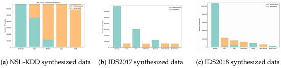 Synthetic samples were generated for the four intrusion classes in the NSLKDD dataset, with the exception of the “Normal” class. To ensure a balanced distribution of samples across all classes, the number of synthetic samples for each class was adjusted to correspond with the number of samples in the largest class. The model’s performance and robustness are improved by this balancing procedure. Conversely, the IDS2017 dataset poses an entirely distinct obstacle. In this dataset, benign traffic accounts for 50% of the samples, which total 696,300 instances. Infiltration, a minor class, has as few as 29 samples. This substantial imbalance cannot be effectively resolved by merely increasing the minor class samples to match the majority class, as this would result in redundant and less diverse data, which could potentially impede the model’s potential to accurately classify the majority class. Additionally, the training process would be considerably slowed by a substantial increase in the sample size. In order to rectify the class imbalance in the CIC-IDS2017 and CSE-CIC-IDS2018 datasets, we implemented a strategy that involved progressively increasing the number of samples in the minor classes to a predetermined level for each class. This method ensures that the class distribution is balanced without sacrificing the efficacy of training or the diversity of the data. Visual representations, such as infographics, can be used to demonstrate the effectiveness of this balancing strategy and the distribution of the samples.