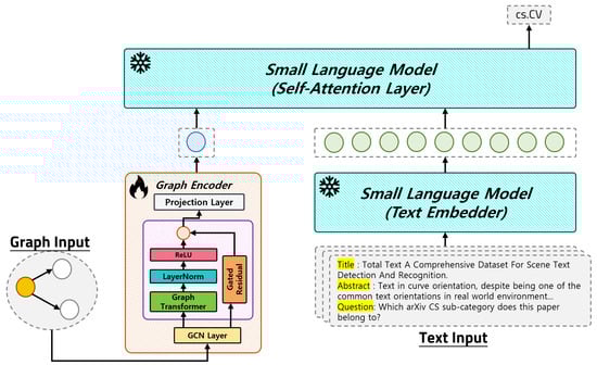 In Figure 1, the proposed method integrates graph-structured data with textual information within a unified framework to enhance representation learning. The architecture is composed of two core components: a graph encoder and a small language model (SLM). The graph encoder combines a graph convolutional network (GCN) and graph transformer layers, effectively capturing both local structural dependencies and global relationships within the graph. A projection layer aligns the graph embeddings with the embedding space of the SLM. The SLM, leveraging self-attention mechanisms, processes textual attributes associated with the nodes, such as titles, abstracts, or questions. This integration enables the model to jointly utilize structural and semantic information, making it highly effective for tasks requiring a deep understanding of both graph and language data. The following sections provide a detailed explanation of the design and implementation of this approach.