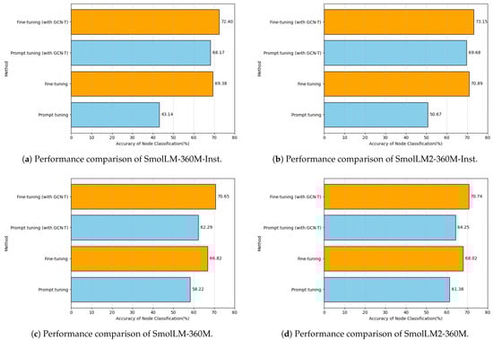 The graphs compare the node classification accuracy of different tuning methods (prompt tuning, fine-tuning, and GCN-T-based variations) for four models: SmolLM-360M, SmolLM-360M-Instruct, SmolLM2-360M, and SmolLM2-360M-Instruct. Notably, the instruction-tuned models (SmolLM-360M-Instruct and SmolLM2-360M-Instruct) exhibited worse accuracy in prompt tuning compared with their non-instruction-tuned counterparts (SmolLM-360M and SmolLM2-360M). This highlights the limitations of freezing the SLM during prompt tuning for instruction-tuned models, which may be less effective in graph-based tasks without fine-tuning.