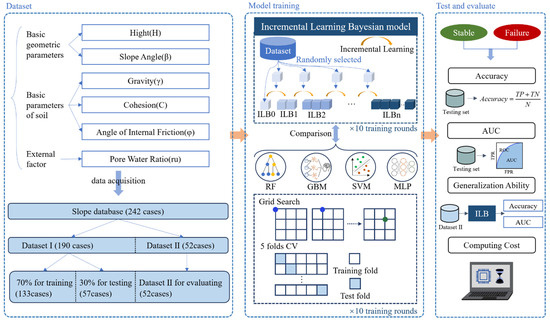 Using six characteristic parameters (, , , , , and ) as input and slope stability classification as output, an ILB model was constructed by combining incremental learning theory with a naive Bayesian model. A stable state of the slope in the dataset is indicated by 1, while an unstable state is indicated by 0. To compare the performance of incremental and batch learning models, this study employed the random forest (RF), gradient boosting machine (GBM), multilayer perceptron (MLP), and support vector machine (SVM) batch learning models alongside the ILB model.
