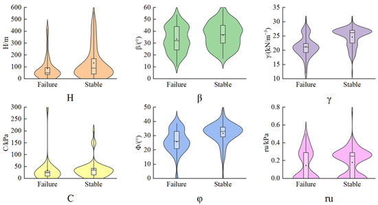 The data, mean, and median values for each variable group are presented in Table 3. The mean and median values differ notably between stable and failure states, with height and angle of internal friction exhibiting the most significant variations. Under stable conditions, the mean and median heights are 24.67 and 26.2, while for the failed state, they are 21.29 and 21.1, indicating deviations of 3.38 and 5.1, respectively. Similarly, the mean and median angles of internal friction in stable conditions are 31.71 and 33, contrasting with 25.8 and 26 for the failed state, indicating deviations of 5.91 and 7, respectively. Additionally, the mean and median values of the six variables in the stable state are higher than those in the failed state.