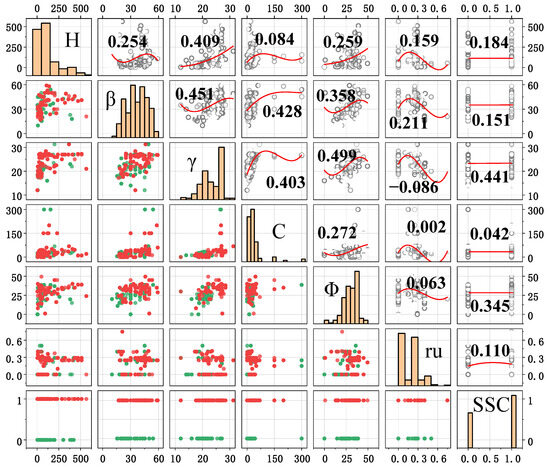 The correlation matrix plot in Figure 3 was analyzed to clarify the relationships among the six parameters and their correlation with slope stability classification (SSC). The plot displays the data distribution and Pearson correlation coefficients between variables. In the figure, the red circles represent unstable slope cases, while the green circles represent stable slope cases. The red lines are curves derived from the distribution fitting of two parameters. Based on other research, a Pearson correlation coefficient exceeding 0.7 may result in multicollinearity [50]. In Figure 3, the maximum absolute correlation coefficient is 0.499, indicating some correlations between variables, but these correlations are not strong enough to cause multicollinearity issues in the database.
