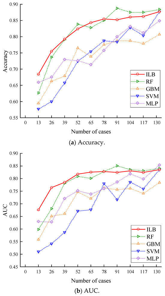 In the training of batch learning models, the dataset is initially standardized, followed by the utilization of the grid search method to identify the optimal parameter combination for each algorithm. The training dataset is partitioned using fivefold cross-validation to facilitate sampling. The range of hyperparameters for each model is detailed in Table 4. To facilitate a comparison with the ILB model, the training dataset is segmented into 10 equal groups, each with 13 cases. Initially, batch training is conducted using the first group of cases, with model performance evaluated based on accuracy and AUC metrics. Subsequently, the first two groups are reintroduced into the batch learning models for retraining, and model performance is tested. This process is repeated, incrementally adding case groups until all 10 are included, completing a full training round. Given that there were four batch learning models, 40 training sessions were conducted in each round. To ensure consistency in experimental conditions with the ILB model, 10 training rounds were also implemented for the batch learning models. Before each training round, the order of cases within Dataset I’s training set was randomized, requiring 400 batch training sessions across all models. Each batch training session involved re-optimization to ascertain the current optimal model. Following 10 training rounds, the accuracy and AUC of the four batch learning models were evaluated using the test set and then arithmetically averaged to establish the mean performance metrics for each model. Finally, point-line plots depicting the average accuracy and AUC of the four batch learning models as a function of the number of input cases were generated, as shown in Figure 4.