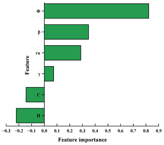 The significance of each feature was determined by ranking their importance and fitting the data with logistic regression, as shown in Figure 6. In logistic regression, the larger the absolute value of a coefficient, the greater the importance of the corresponding feature. In Figure 6, the angle of internal friction emerges as the most crucial feature, followed by slope angle and pore water ratio. Conversely, slope height, cohesion, and unit weight are less important. These data underscore the impact of each selected feature on prediction results, validating the rationale behind feature selection in this study. Liu, et al. [51] ranked the factors that affect slope stability and found that overall slope angle and angle of internal friction are the most important indicators, while the importance of slope height is low. Wang, et al. [52] listed unit weight as the least important factor in the study of slope stability. Consequently, enhancing slope stability entails improving the angle of internal friction and reducing the overall slope angle. Employing engineering techniques to enhance slope soil’s internal friction angle and decrease the overall slope angle is an effective strategy for bolstering slope performance.