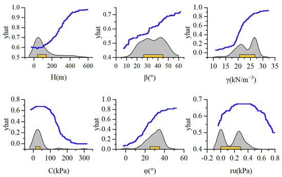 The PDP curves in Figure 7 exhibit fluctuations, indicating the influence of the six selected variables on classification outcomes. The lower segments of the curves are violin plots of variable distributions. Ups and downs in the curves signify a variable’s impact on model predictions, while parallelism to the horizontal axis suggests negligible influence. Among the variables, unit weight (), angle of internal friction (), height (), and slope angle () curves demonstrate an increased likelihood of stability with larger values. Cohesion () initially enhances stability probability but sharply declines afterward, potentially due to limited data beyond a certain point. The pore water ratio () curve forms an inverted U-shape, showing initial stability improvement with until a peak, followed by a subsequent decline beyond a specific threshold.
