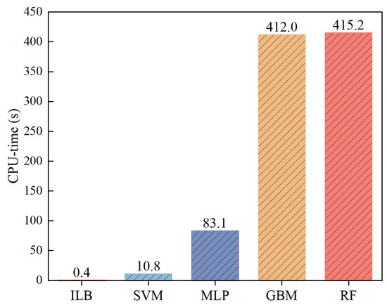 Computational efficiency is a crucial metric in machine learning, primarily influenced by computer setup and model selection. This study employs CPU time as an evaluation metric to compare model efficiencies. During training in a CPU i5-7400 and GPU GTX 745 environment, the ILB model exhibited the shortest CPU time of 0.4 s, as shown in Figure 9. SVM and MLP followed with CPU times of 10.8 s and 83.1 s, respectively. In contrast, GBM and RF required over 400 s, showcasing comparatively longer CPU times. The significant CPU time difference between the ILB and batch learning models is noteworthy. The ILB model’s CPU time is approximately 1/1000 that of the RF model, highlighting a substantial difference. Batch learning models often involve tuning hyperparameters through grid search methods, a time-consuming step due to the numerous hyperparameters involved. In contrast, the ILB model does not require hyperparameter adjustments, contributing to its significantly higher computational efficiency than batch learning models. The high computational efficiency of the ILB model provides it with unique advantages in real-world applications. On one hand, this ensures that the model is always up-to-date when predicting landslide disasters. As researchers collect new slope cases, the model can be immediately updated, thereby enhancing its performance. On the other hand, this facilitates the development of an online slope prediction platform. Different researchers can upload newly collected slope cases to the platform via the internet, enabling real-time updates to the prediction model, thereby creating a slope prediction platform with improved forecasting capabilities.