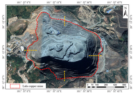 To validate the ILB model’s applicability, 15 slope cases were referenced from the study of Lin, et al. [55]. These cases comprise 11 collected by the authors from various papers and 4 examples from the Lala Copper Mine in Sichuan Province, China, numbered 12, 13, 14, and 15. Situated in Lushui Township, Huili County, Sichuan Province, as depicted in Figure 10, the Lala Copper Mine encompasses an eastern and western open-pit mining area, with the latter containing the East, West, South, and North slopes of the eastern open-pit. The yellow dashed lines in Figure 10 represent the approximate positions of the slope profiles, which were determined based on the descriptions provided by the original authors.