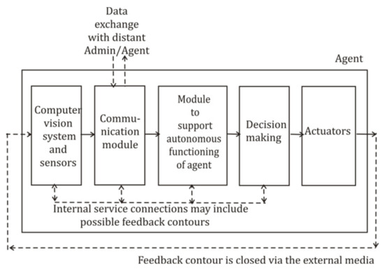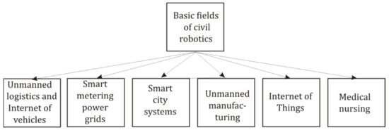 Modern research in civil robotics includes at least such fields (see Figure 1) as unmanned logistics and Internet of Vehicles (IoV) [1], power grids with smart metering [2], “smart” city [3], autonomous robotic manufacturing [4], Internet of Things (IoT) [5], and medical nursing [6]. The general goal of these investigations, which are based on artificial intelligence (AI) concepts of agents and multi-agent systems (MASs), is to imitate human abilities and to design autonomous and self-sustaining large-scale robotic systems which can operate in wide space-and-time bands without permanent human control. However, the design of autonomous robotic agents is a complicated task, and the development of such systems involves the whole spectrum of conjugated technologies, including the research of modern mathematics [7,8], 5/6 G Internet [9], microprocessors [10], neural networks (NNs) [11], fuzzy logic and controllers [12], computer vision [13,14] and speech procession [15], big data procession [16], traditional and post-quantum cryptography [17], quantum key distribution [18], and quantum computing [19]. The design, debugging, and modification of autonomous agents include autonomous data verification and correction of errors, caused by natural factors or cheaters [18].