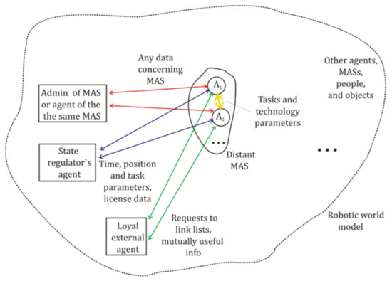 The typical basic set of dialog communications for mass agents is shown in Figure 2, where robotic agents from some allocated MASs are supposed to carry out work in a space scene of action, including various individual partner and rival robots, MASs, people, animals, buildings, vehicles, and other objects. All of them are supposed to be recognized by a computer vision system [13,14] or LIDAR [66,67]. Here, for the sake of simplicity, we do not consider dashcam videos, which are a useful tool for verification but need massive AI-based image procession. The agent in the allocated MAS can interact with its administrator, which is used to support the distant work of the agent and should verify some of its parameters in a planned mode or during the correction of the robot’s behavior. The agent is supposed to exchange all possible communication messages with the administrator (marked by red arrows) and to use limited data sets in dialogs with other agents of the same MAS (shown by yellow arrows). In the last case, messages can mainly include parameters of the scene and tasks. Also, the scene of action imposes the presence of mobile or static agents of corporative and state regulators [26], checking licenses, payments, and technical parameters of robots. Agents of MASs should typically exchange with them by using the limited set of formal messages (marked by blue arrows). The verification method also should take into account possible data exchanges between the agent of some MASs and loyal external agents or network nodes [26,68] involved by mutual services or a rent. The data flow between such pairs of robots (marked by green arrows in Figure 2) can contain requests to send some necessary data or tools, or to write/read notations in the distributed copies of LL protected data storages [68,69]. Potentially, people in the scene also can communicate with robots concerning positioning, parking, and other common problems, using special tools for the translation of robotic messages to people and vice versa. Another aspect of the dialog man-agent is the necessity to combine human checks with fully automatic ones in the case of attacks and faults. For mass robots, automatic and human procedures are preferable to using universal formal notations and code representations in order to reduce expenses. However, the automatic verification may need more detailed and precise description of parameters, as modern agents cannot make generalizations and analogies like human beings. Thus, even minimalistic consideration of the scene of action demonstrates the necessity to describe the branched structure of communicating participants and options in the dialog protocol.