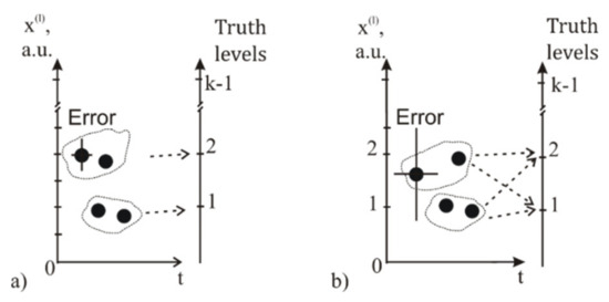 Data error limitation for the choice of correlated variable, . (a) Correct mapping onto the scale of truth levels. (b) Case (b) differs from (a) by the large error value, where each of two groups of data can be classified both as 1 or 2. Incorrect mapping occurs if the statistical and measurement error,, exceeds the difference between two close truth levels, i.e.,.