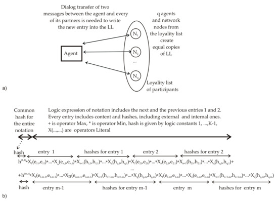 The simplified scheme of AGA-version LL is shown in Figure 5a, where the pre-agreed collective of mutually loyal robots and network nodes is written in the list of participants and creates equal copies of the collectively formed ledger [68,69]. The formal expression structure for AGA-based LL is shown in Figure 5b. The next notation consists of common hash, the previous entry, and the next entry. The entry includes content data and hashes, which can be assigned by external nodes and internal subsystems of the agent. Here, the first logic entry is mixed with the second entry, and, further, the second one is mixed with the third one, etc. Thus, LL “mixes”, by logic operations, random hash values, assigned by external network participants and internal devices with previous and forthcoming entry vectors, e. The MVL version of LL needs to have some store of quasi-random one-time hash values [18] preliminarily generated by a high-quality QRNG [78]. These hash values are being used as access keys in further procedures. Like in the basic blockchain method [54,55,56], useful data written in the entry can be approved collectively by the majority voting of participants, whose result is considered the most reliable one. Certainly, the reliability of such data depends on the number of really involved external participants, and for its small value, it is desirable to introduce additional approving data taken from various internal sources. Due to this reason, the advanced version of AGA-based LL [68] can mix parameters of internal subsystems of the agent with externally assigned hash values.