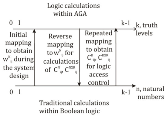 Mobile agents should imitate the human ability to estimate time, space, light intensity, and some other parameters in wide bands of values and with various precision (e.g., from micrometers to thousands of kilometers). In order to obtain a wide range of measurements, to avoid too-large numbers of truth levels (), and to use cheaper hardware, one can use the method of correlated variables. It helps to combine in one AGA logic expression data, describing the same physical parameter with various precision of data in the same function. The description of, e.g., position = 2830 m for the space axe can be represented in the digital map as and written by an expression like . This expression can be represented in the MVL truth table with any necessary precision as a set of -correlated input variables, Such variables should be processed as ordinary logic variables in the multi-parametric AGA function [70], but only the summation of the whole set of used correlated parameters provides correct restoration of physical distances. This step should be monitored in methods described in Section 3 and Section 4 for forward and backward mapping, if one use transitions between the truth levels representation and the natural numbers one.