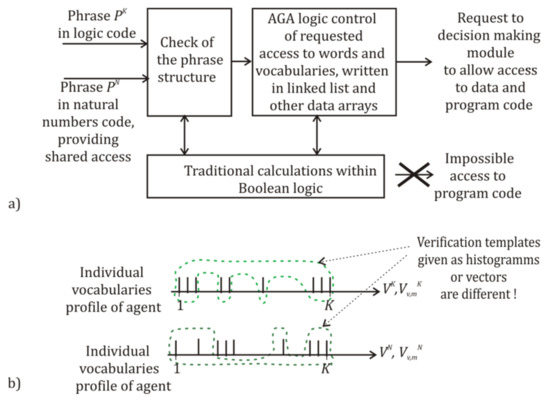 (a) The simplified scheme of AGA-based LL formation [68,69], which includes the twice transfer of messages between the agent and network participants of the protocol. The list of possible participants should be formed in advance; it includes agents of the same MAS and network partners nodes. (b) The structure of logic AGA expressions, defining AGA-based versions of LL.
