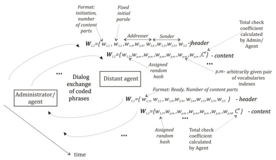 The abovementioned two classic algorithms were the motive to consider further methods for the long storing of confidential data in distant agents. Illegal data modification is the well-known problem for classical cryptography systems; the attacker can do it in a distant node, located out of the trusted zone [18]. A possible solution was prompted here by blockchain scheme [54,55,56] for cryptocurrency mining, where the principle of LL was used. As the basic LL method is too complicated to be used in mass robotic platforms, the AGA-based version of LL [68,69] was designed. It was proposed for agents and loyal network nodes, possessing limited free memory resources. As verification tasks do not always need large traffic and capacity of data storage, they may involve the distributed set of limited free memory resources. A possible variant here is to use low-capacity data storages created in collaborating network agents and loyal network nodes, which in fact are to be used as external “witnesses”. However, the problem here is to create an auxiliary low-traffic local network, excluding the penetration of illegal code from Internet into agents. Besides additional data channels, it is preferable to use a special communication language, incomprehensible to other modules. Earlier designed template-matching AGA procedures [75] encouraged using it for the design of the special dialog protocol, presented further for data exchange in a local network of communication modules of agents. It includes the formal logic language for dialog interaction of agents that is based on vocabulary structure, describing terminology of the robotic system by means of special secret codes. The proposed further protocol is the method to unite verification procedures, data coding schemes, and local confidential storages under the holistic system for reliable data exchange and checks, combining basic agents and collaborating external robots. Here, the final goal of research is to design a comprehensive set of AGA-based algorithms for the realization of an autonomous agent and to find the reasonable trade-off between AGA and traditional Boolean methods.