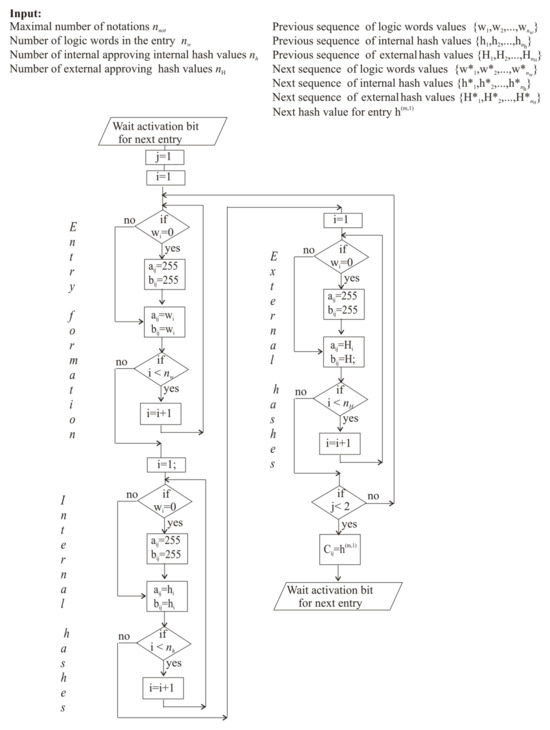 em−1 = (e1,m−1,……,en,m) and approving sets of quasi-random hash values are hm= (h1,m,…,hQ,m) and hm−1 = (h1,m−1,…,hQ,m−1) Q is the number of external participants, approving data written to LL. AGA logic expression, Eq. (5), for LL has the structure