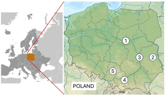 Location of experimental apiaries on a map of Poland. The location numbers are the same as those in Table 1.