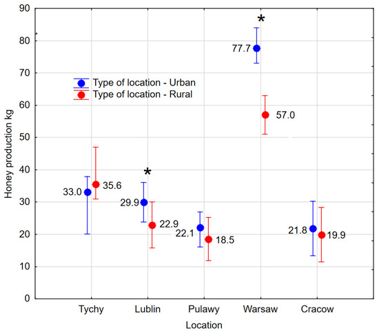 Geographic distribution of honey harvest, distinguishing between urban and rural locations. The vertical bars represent 95% confidence intervals. * Significant differences between urban and rural apiaries within a specified region.
