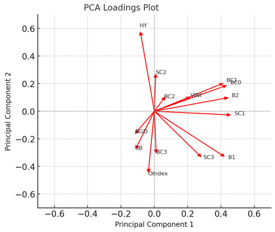 The first principal component (PC1) explains 28.3% of the total variance, while the second component (PC2) accounts for 13.8%. The PCA revealed five principal components (PCs), which collectively explained 71.4% of the observed variance. The variables B1, B2, BC0, BC1, and SC1 exhibited strong positive loadings on PC1, indicating their significant contribution to this component. OIndex and HY exhibited strong positive loadings on PC2, suggesting that they play a key role in distinguishing variance along this dimension. Some variables (e.g., BC1, SC3) contributed to both PC1 and PC2, indicating that they influence multiple aspects of variance in the dataset (Figure 3 and Supplementary Figure S4).