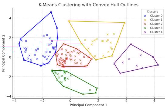 Clustering was performed using the K-Means method with five clusters and convex hulls. The average silhouette score was 0.39, indicating slightly better cluster separation compared to the previous three-cluster partitioning (Figure 4). The variables that most effectively differentiate the clusters using the Random Forest classifier have been identified. The most significant features have been ranked according to their contribution to cluster differentiation (see Table 7).