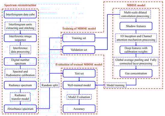 The overall processing flow of the interferogram data cube obtained by the SMWIR-IFTS is shown in Figure 2. First, spectrum reconstruction is performed on the interferogram data cube to obtain the absorbance spectrum of the target gas. Next, the absorbance spectra of the target gas are randomly split into training, validation, and test sets in proportion. The training set data is used to train the MDISE model, with the validation set data applied for hyperparameter tuning during the training process. Finally, the test set data is used to validate the trained MDISE model, and the gas concentration inversion accuracy of the MDISE model is obtained.